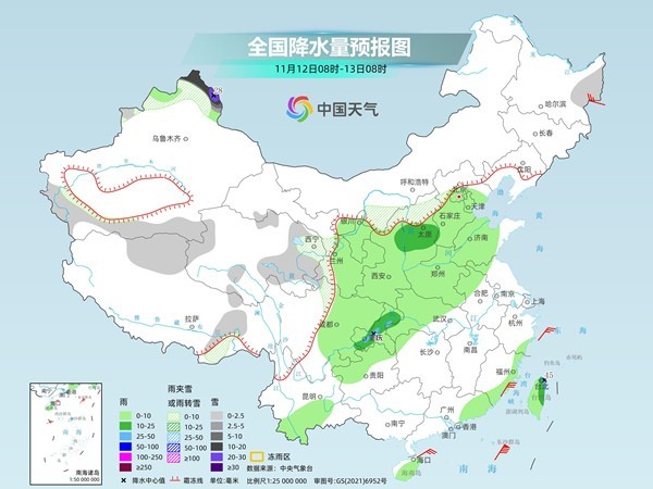明天,内蒙古河套地区、新疆北疆北部和北疆东部、西藏东部和北部、宁夏中北部、陕西北部等地部分地区有小到中雪或雨夹雪,其中,新疆北疆东部等地部分地区有大到暴雪,局地大暴雪(20~22毫米)。辽宁西部、华北中北部和南部、黄淮东部和西部、重庆中部、华南南部等地部分地区有中到大雨,其中,广东东南部沿海等地部分地区有暴雨。