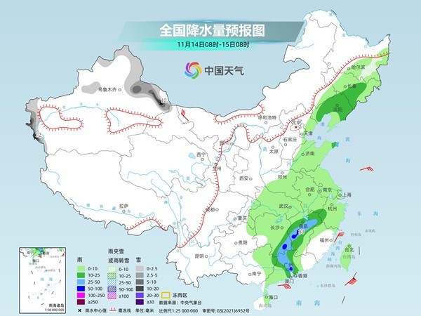 后天,黑龙江东南部、新疆南疆西部山区和北部等地部分地区有小雪或雨夹雪,其中,新疆南疆西部山区和东部等地部分地区有中到大雪,新疆南疆西部山区和东部等地局地暴雪(10~12毫米)。东北地区西部、吉林东部、东北地区南部、江南中南部、华南北部、广东中部等地部分地区有中到大雨,其中,湖南南部、江西中部、广东中部等地部分地区有暴雨(50~80毫米)。