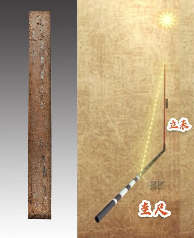 △左图为圭尺,右图为圭表成组使用示意图