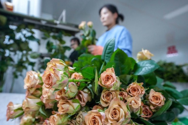 2024年8月23日,在云南晋宁花卉产业现代化示范园采后处理中心,花农将鲜切花放入自动分拣流水线上进行分拣。新华社记者 陈欣波 摄