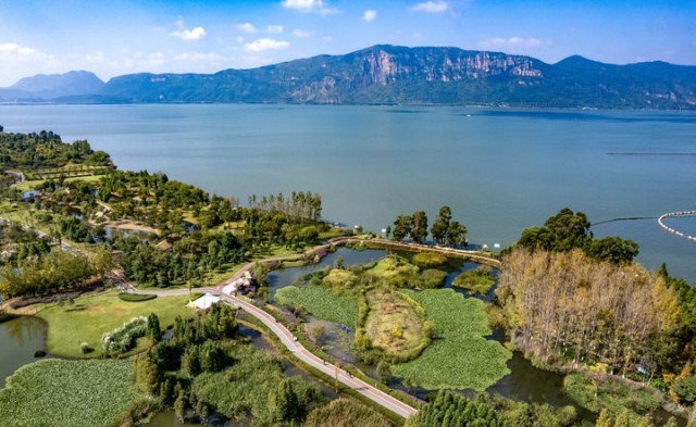 这是2024年10月18日拍摄的云南省昆明市滇池及星海半岛湿地公园(无人机照片)。新华社记者 陈欣波 摄