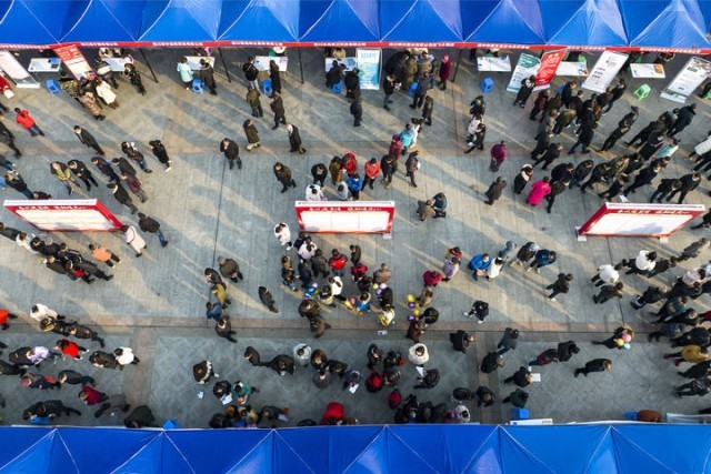 2023年1月31日,在四川省阆中市人民广场,求职者参加东西部劳务协作暨春风行动大型招聘会(无人机照片)。新华社发(王玉贵 摄)