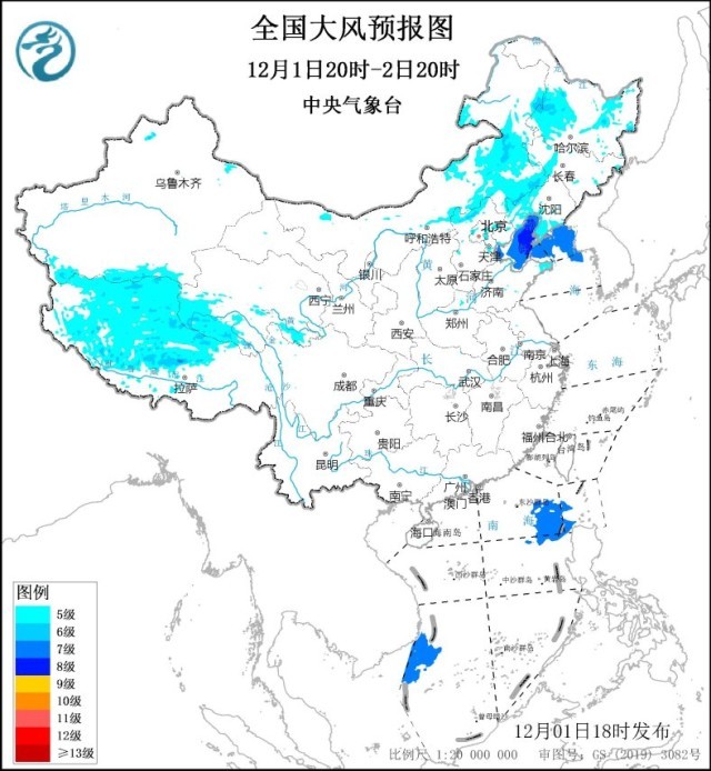 12月2日20时至3日20时,西藏北部和西部、内蒙部东部、甘肃北部、吉林西部等地将有5~6级、阵风7~8级风;台湾海峡、巴士海峡、南海东北部海域将有7~8级、阵风9级的大风。
