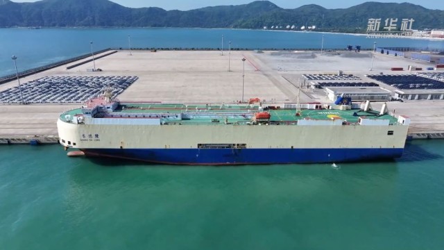 在深圳深汕特别合作区的小漠国际物流港,1016辆新能源汽车有序驶入滚装船,前往东南亚。