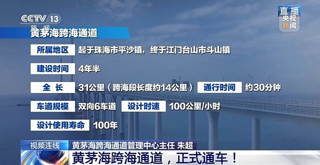 黄茅海跨海通道的通车,使得珠海到江门开车缩短至30分钟。除此以外,还将对沿线城市以及区域经济发展会带来什么样的变化?又会对大湾区经济一体化的发展产生什么作用?《新闻 1+1》本期节目邀请了黄茅海跨海通道管理中心主任朱超、中山大学区域开放与合作研究院院长毛艳华,一起分析解读。