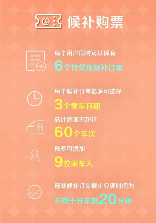 每个用户可以有6个待兑现候补订单,每个候补订单最多可选择3个乘车日期,总计添加不超过60个车次。
