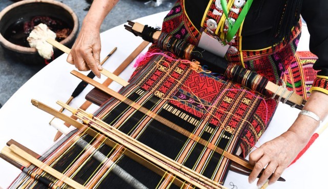 在2023海南锦绣世界文化周非物质文化遗产传统织绣印染技艺项目精品展上,手工艺人在编织黎锦(2023年4月30日摄)。新华社记者 杨冠宇 摄
