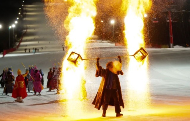 吉林市北大湖滑雪度假区,表演者在第二届世界寒地冰雪经济大会现场进行火壶表演 新华社