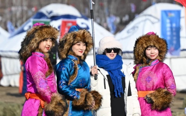 游客(右二)在内蒙古冰雪那达慕上与演员合影 新华社