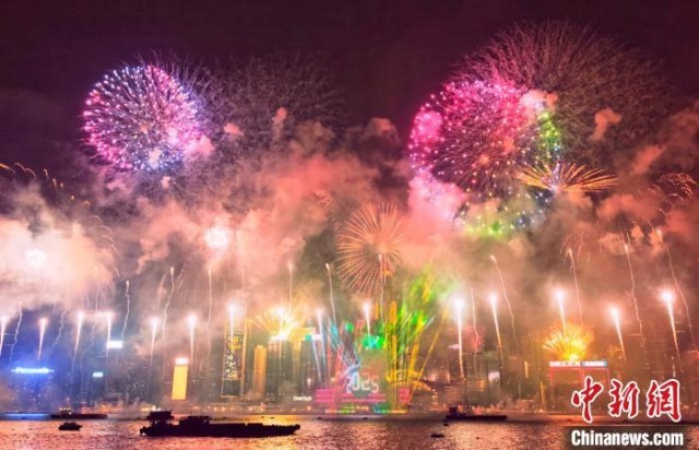 “5、4、3、2、1,新年快乐。”伴随着尖沙咀钟楼敲响新年钟声,从5艘趸船、16艘浮船上燃放的烟花在空中绽放,点亮自北角至中环约1300米的夜空,烟花、音乐、灯光表演与维港夜景相映成趣,成为夜空中绚烂图画。
