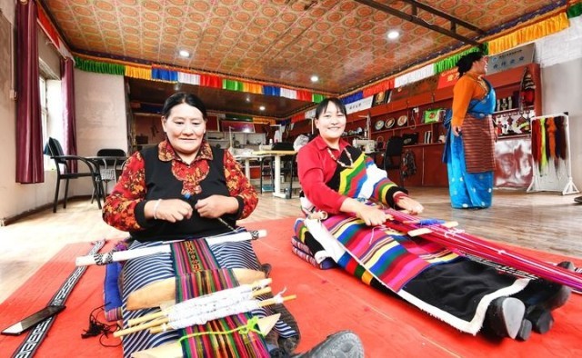 2024年6月11日,村民在长江源村岗巴布民族手工艺品加工专业合作社加工氆氇。