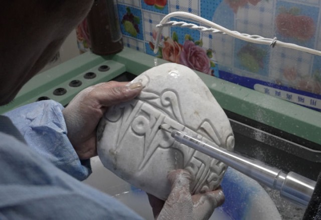 2024年10月17日,村民在岗巴布民族手工艺品专业合作社内雕刻玛尼石(视频截图)。