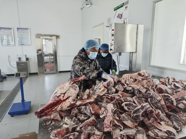 2024年1月23日,长江源村村民在村内精深加工基地加工牦牛肉。