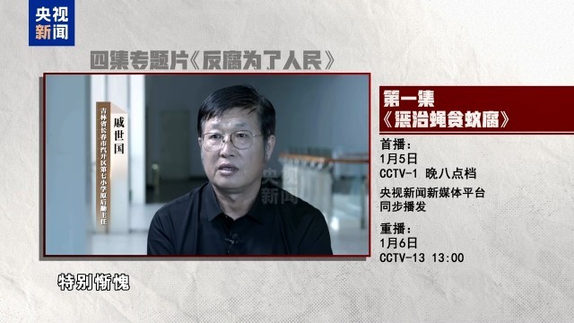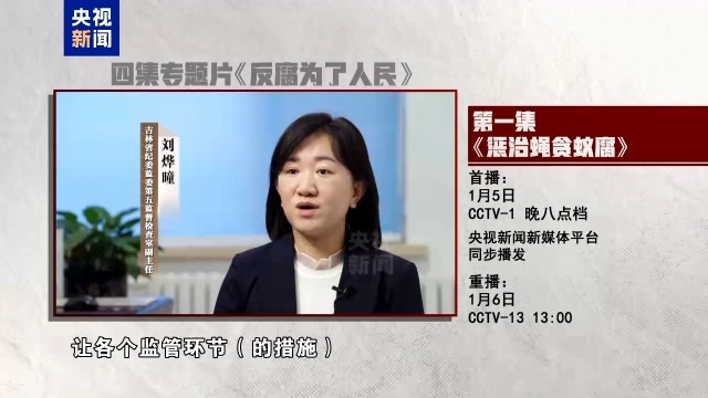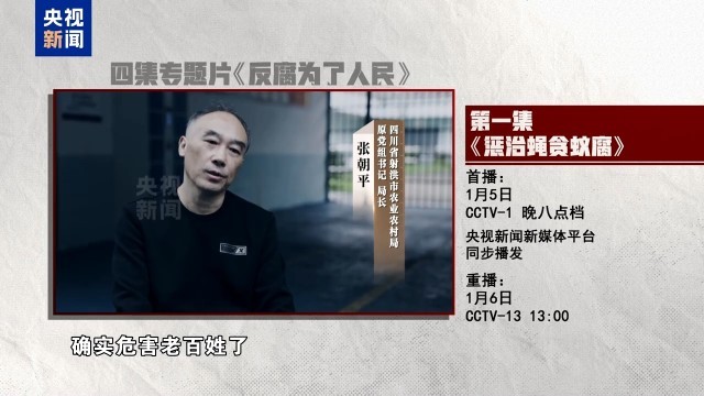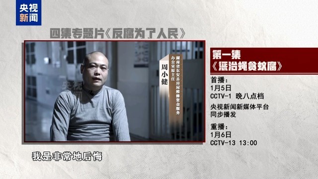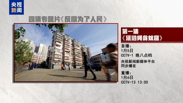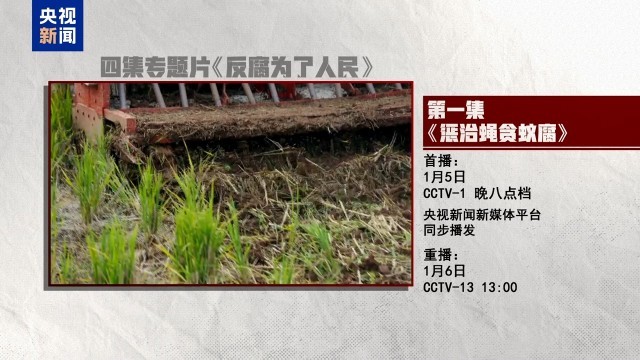 电视专题片《反腐为了人民》第一集《惩治蝇贪蚁腐》,讲述纪检监察机关聚焦群众反映强烈问题,推动开展校园餐、高标准农田建设、住房保障和安居工程等整治工作,让群众从一个个具体问题的解决中感受到整治成果,不断增强获得感、幸福感、安全感。央视综合频道1月5日晚8点档播出,央视新闻新媒体平台同步播发,敬请关注。