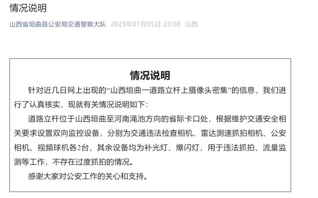 据山西省垣曲县公安局交通警察大队微信公众号消息,针对近几日网上出现的“山西垣曲一道路立杆上摄像头密集”的信息,山西省垣曲县公安局交通警察大队发布情况说明。