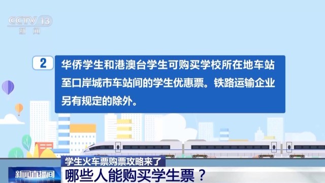 华侨学生和港澳台学生可购买学校所在地车站至口岸城市车站间的学生优惠票。铁路运输企业另有规定的除外。