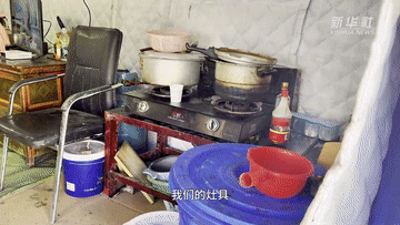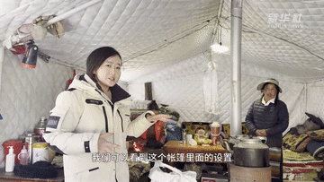 采访中,记者走进一间帐篷进行探访。在帐篷内可以看到灶具、水桶、厨具、炉子,还有藏式沙发、桌子,甚至还有电视。据女主人介绍,地震发生后,老百姓领到了被子、泡面、馒头、菜、肉、燃料等救灾物资。