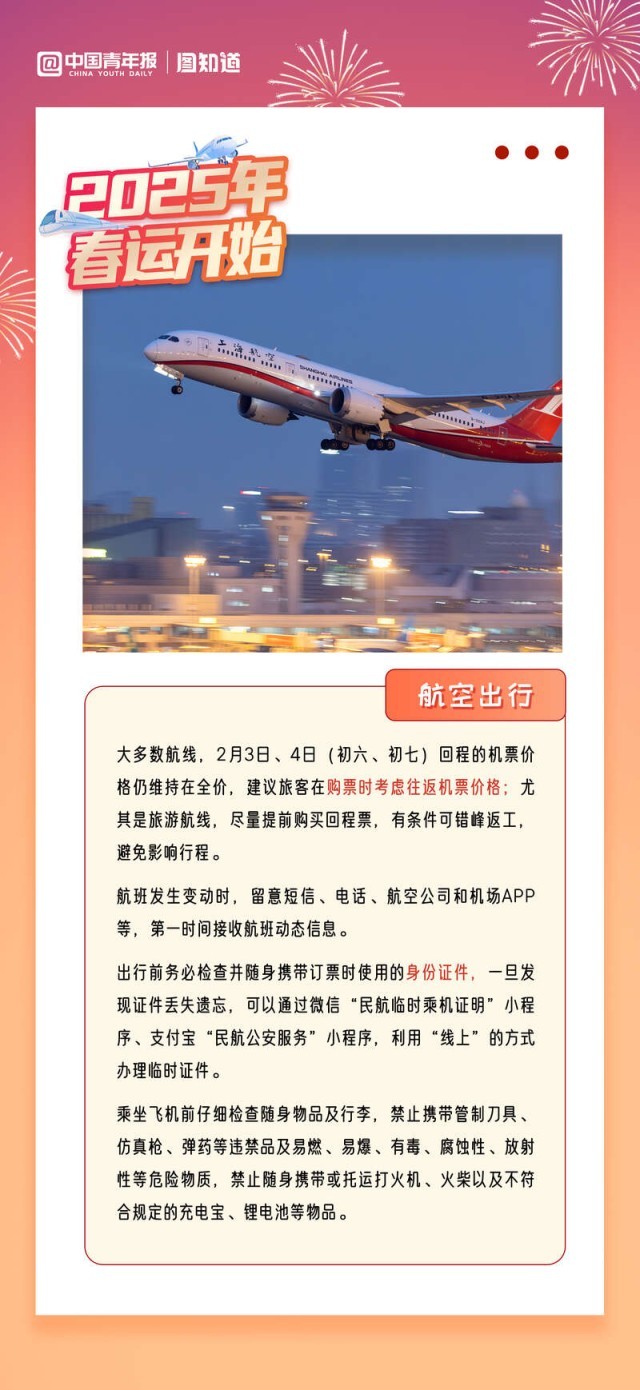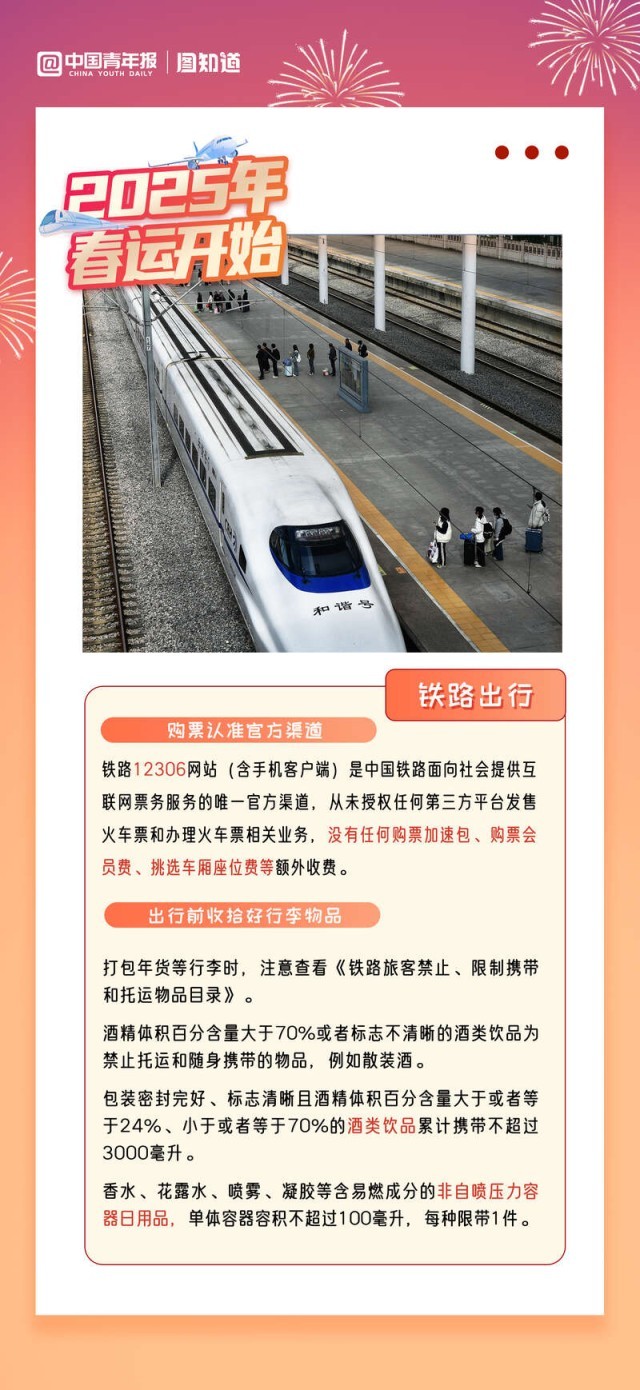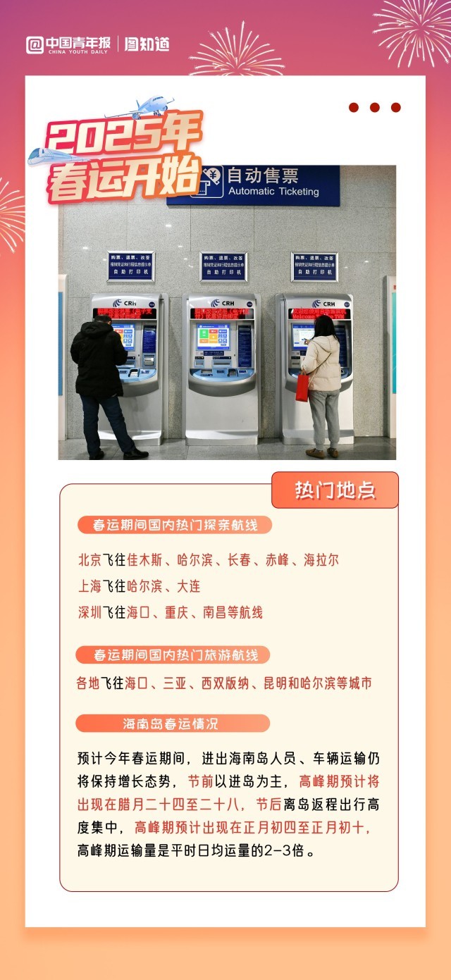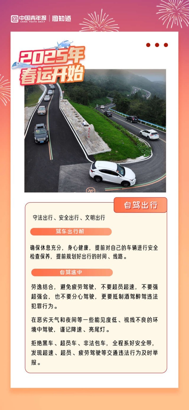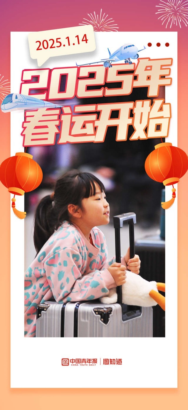 根据国家发展改革委的信息,2025年春运将从1月14日开始,到2月22日结束,为期40天。春运期间,全社会跨区域人员流动量将达到90亿人次。中青报整理了一份贴士,涵盖自驾、铁路、航空、气象出行信息,快快收藏。