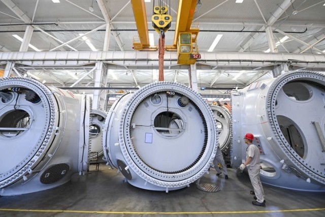 工人在位于山西转型综合改革示范区的太重集团新能源产业园区吊运风电装备(2024年5月30日摄)。新华社记者 杨晨光 摄