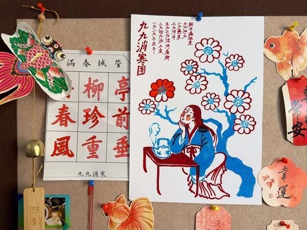 依照我的年货“日历”,冬至起便要在家中张贴“九九消寒图”作为年画,有时是九画九字的“庭前垂柳珍重待春风”,有时是美人托腮赏九朵九瓣的梅花,每日涂一笔、染一瓣或在空白处记录简洁日记,色满则春至。