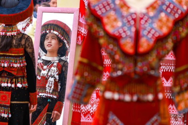 近日,在云南省红河哈尼族彝族自治州开远市的苗族集市上,少数民族群众在试穿新衣。新华社发(陶家淇 摄)
