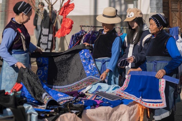 近日,在云南省大理白族自治州洱源县凤羽古镇年集上,当地村民挑选新衣。新华社发(罗新才 摄)