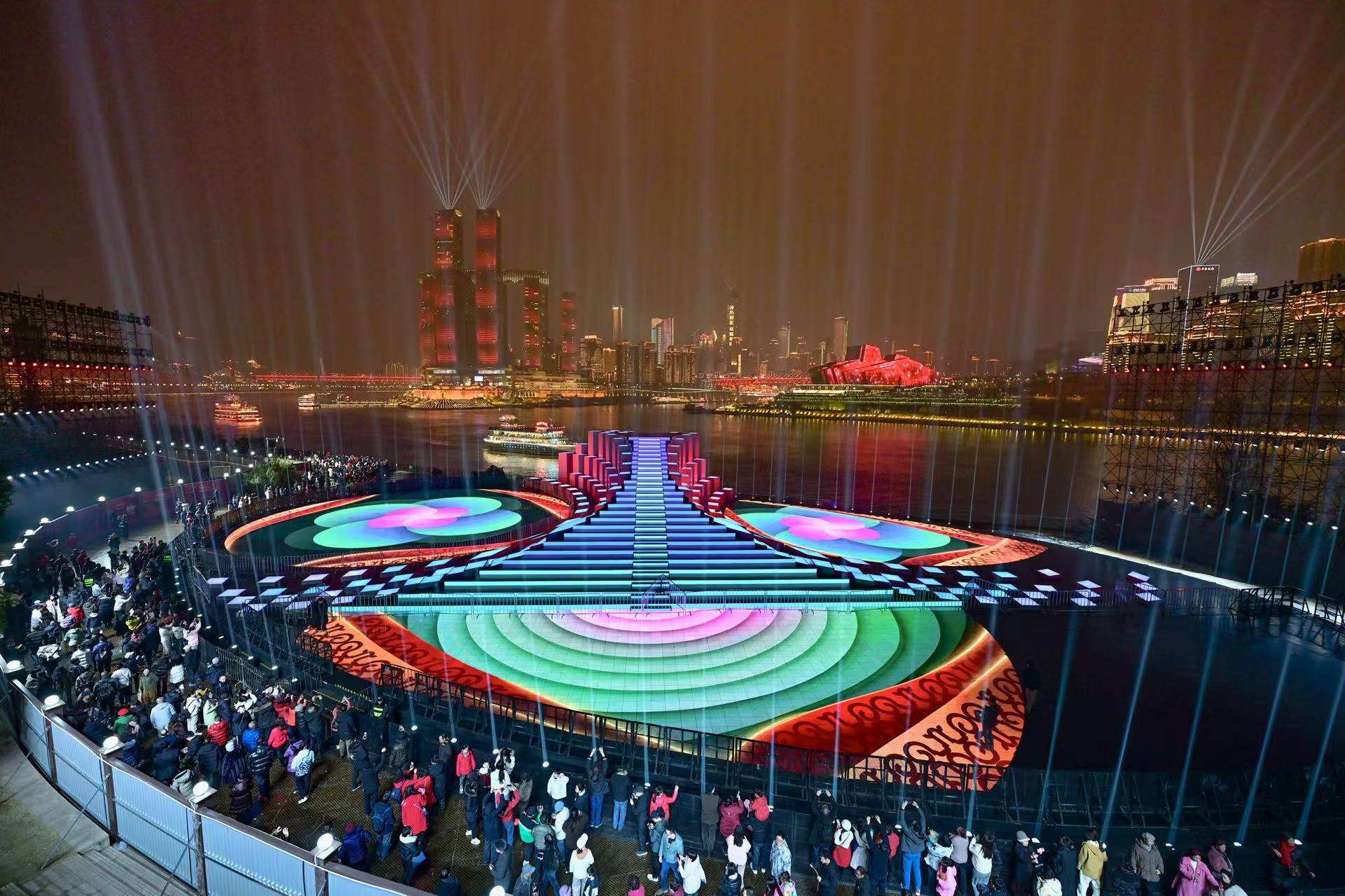 “月影斑驳,光影跳动,霓虹闪烁,江城相映,晚舟轻舞……这就是一幅流动的山水都市画卷,让人如梦似幻!”1月31日晚,在南岸区弹子石广场——央视春晚重庆分会场主舞台,操着天南地北口音的游客从四面八方汇聚而来,或打卡拍照,或隔江眺望,无不为眼前的场景啧啧称赞。