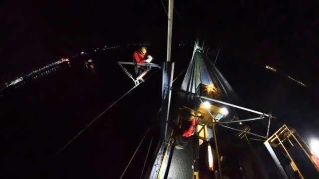 和电影里在高楼大厦间飞檐走壁的蜘蛛侠不同,被称为“海上蜘蛛侠”的许冲和工友们,每天凌晨都“穿梭”在福建湄洲湾海域40多米高的上空。