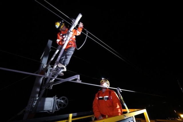 凌晨1点,在福厦高铁湄洲湾跨海大桥上福州供电段莆田高铁供电工区的接触网工们在检查接触网供电设备。徐亮摄