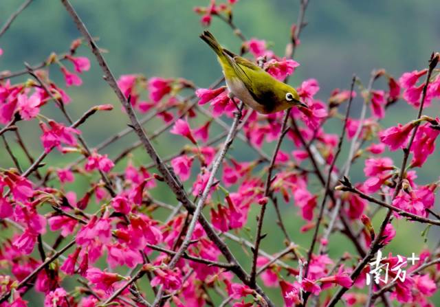 广州黄埔创业公园樱花盛开,绣眼在花丛中欢乐觅食。