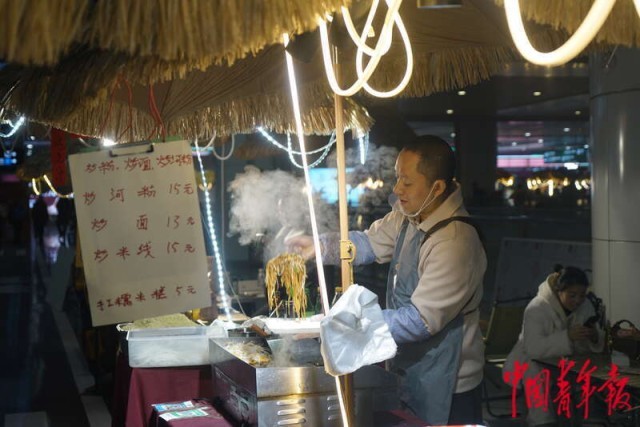 2月5日,重庆市渝北区,重庆北站北广场地下一层的市集,一名炒粉摊主刚刚给顾客炒好一碗粉。中青报·中青网记者 李强/摄