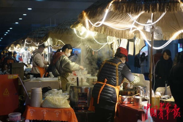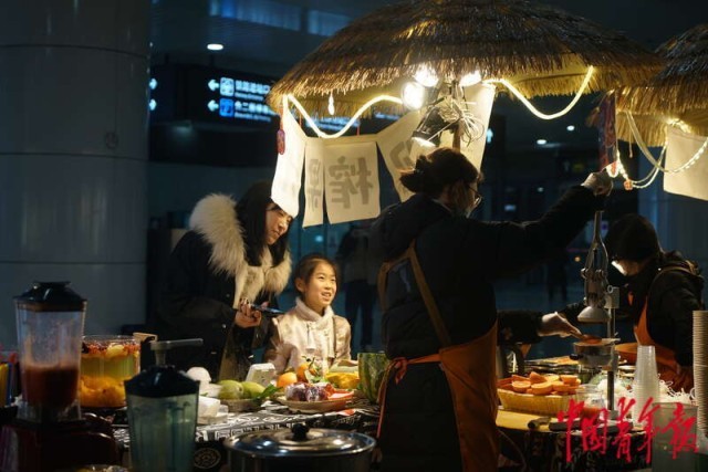 这是一处位于重庆北站北广场落客区与进站口之间的小市集,许多出发和到达的旅客拉着行李箱在此短暂停留,有的买上一碗热腾腾的抄手,有的点上一杯鲜榨的果汁。一名年轻摊主告诉中青报·中青网记者,多年来这里都禁止摆摊,但今年开始允许摆摊。今年春节期间,二三十家摊位有序地在这里摆卖,让这座高铁站变得烟火气十足。来这里摆摊的有许多年轻人,在一名年轻摊主看来,这个新举措挺好,尽管摊位费有些贵,但高铁站客流量大,在这里摆摊能增加就业,“养家糊口”。一名在此帮儿子摆摊的妇女觉得,这里放开摆摊后,不仅方便了往来的乘客,一些年轻人也多了一份收入。记者注意到,近年来,不少城市选择放开“地摊经济”,地摊经济成为城市消费的新业态。中青报·中青网记者 李强/摄