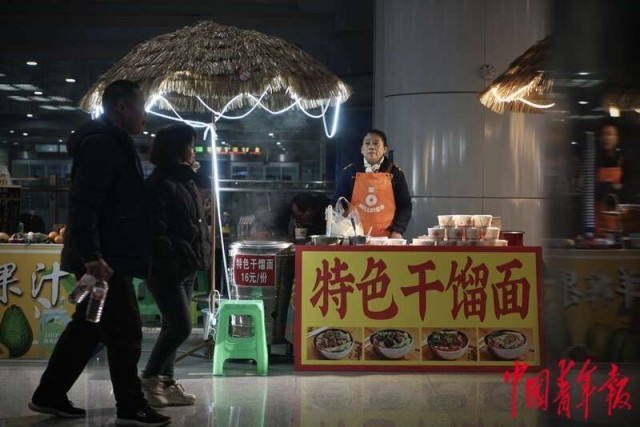 2月5日,重庆市渝北区,重庆北站北广场地下一层的市集上,一家售卖干馏面的小吃摊等待顾客光临。中青报·中青网记者 李强/摄