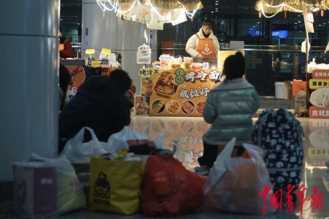 2月5日,重庆市渝北区,推着行李箱的乘客路过重庆北站北广场地下一层的餐饮摊。中青报·中青网记者 李强/摄