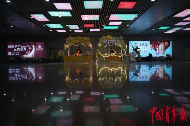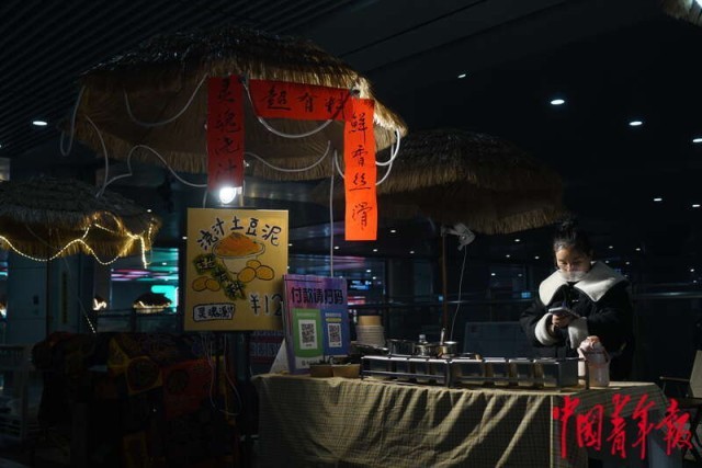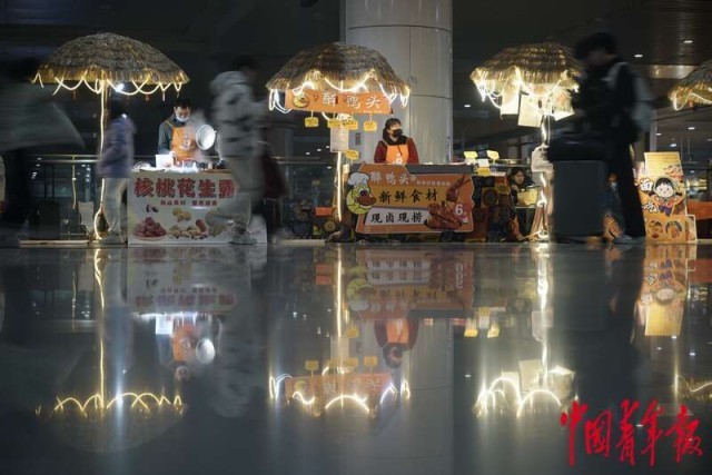 2月5日,重庆市渝北区,两个年轻人在重庆北站北广场地下一层的市集上摆摊卖暴打柠檬茶和梨汤。中青报·中青网记者 李强/摄