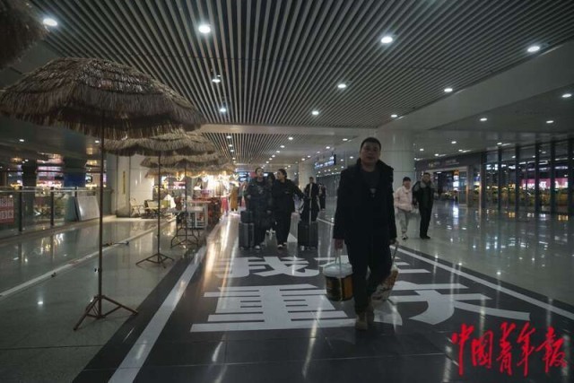 2月5日,重庆市渝北区,拉着行李箱的乘客路过重庆北站北广场地下一层的小市集。中青报·中青网记者 李强/摄