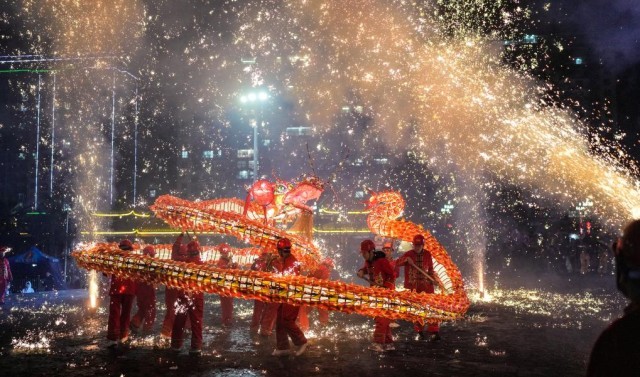 2月11日晚,人们在台江县参加“舞龙嘘花”活动。新华社记者 陶亮 摄