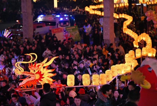 2月10日晚,在湖北省宣恩县城兴隆老街,百米板凳龙在人群中游行。新华社发(宋文摄)