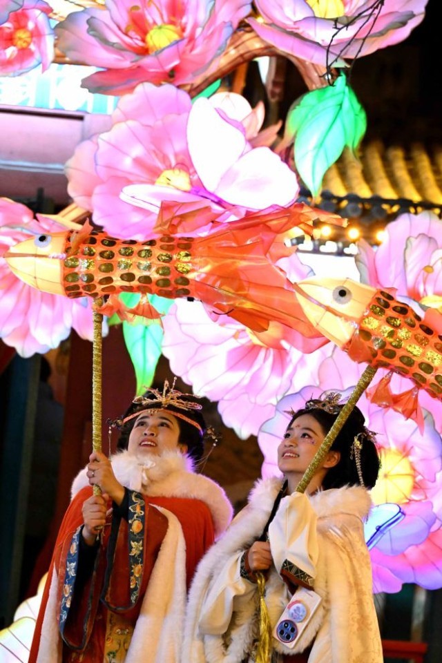 2月8日晚,身着传统服饰的游人在河北省石家庄市正定荣国府影视基地内游园赏花灯。新华社发(陈其保摄)