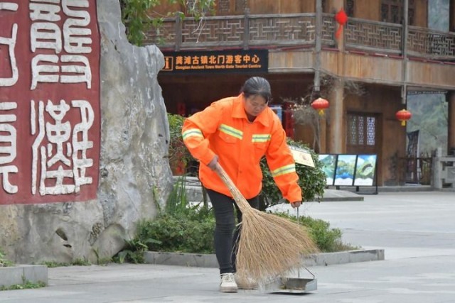 图为冉友琼在龚滩古镇北门广场打扫清洁。(受访者供图)