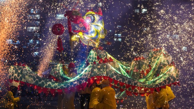 2月11日晚,人们在台江县参加“舞龙嘘花”活动。新华社记者 陶亮 摄