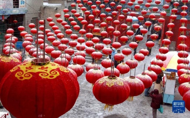 2004年2月1日,兰州市隍庙内白雪掩映下的红灯笼更显喜气。新华社记者 韩传号 摄