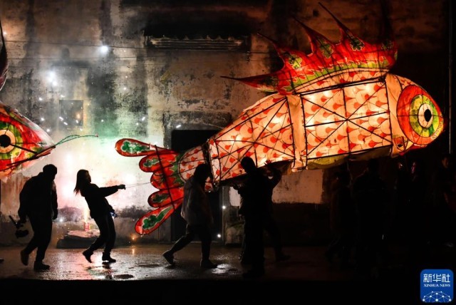2021年2月26日,在安徽省黄山市歙县溪头镇汪满田村,游客和村民嬉鱼灯,闹元宵。新华社记者 韩旭 摄