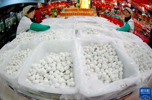 2011年2月11日,宁夏银川某大型超市的工作人员在摆放元宵。新华社记者 彭昭之 摄