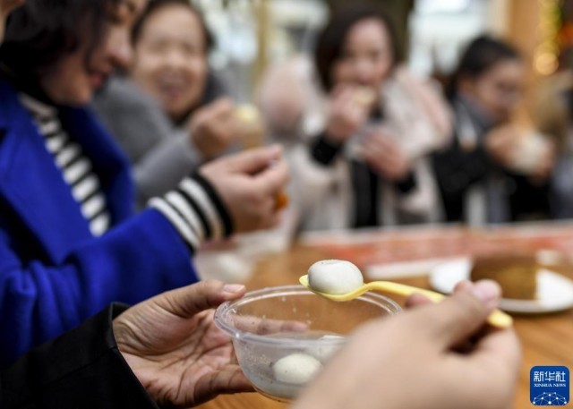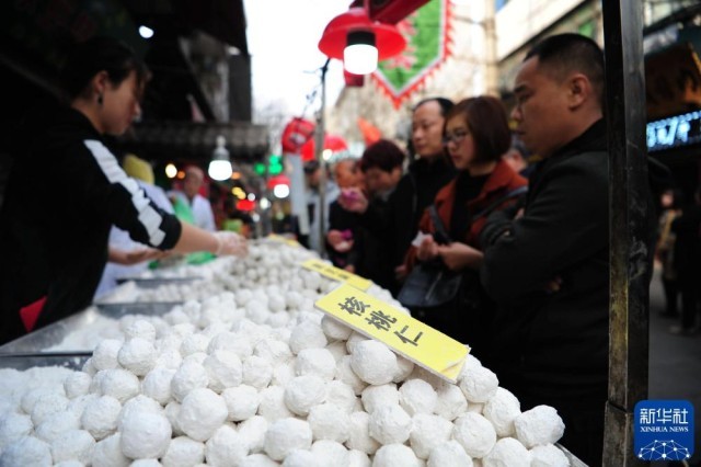2019年2月19日,在新疆乌鲁木齐大巴扎步行街,市民和游客品尝元宵。新华社记者 王菲 摄