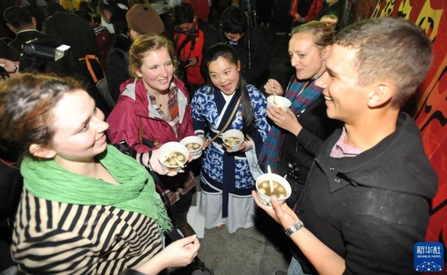 2013年2月24日,在广西桂林阳朔西街,几名外国游客品尝汤圆。新华社记者 陆波岸 摄