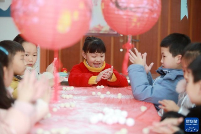 2021年2月24日,在江苏省扬州市杉湾花园社区,小朋友动手包汤圆。新华社发(孟德龙 摄)