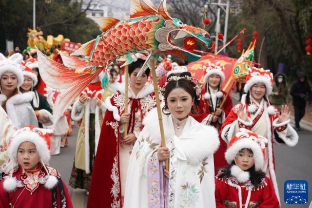 2025年2月11日,江苏省盱眙县举行元宵节民俗汇演活动。这是展演队伍在道路上巡游。新华社记者 季春鹏 摄