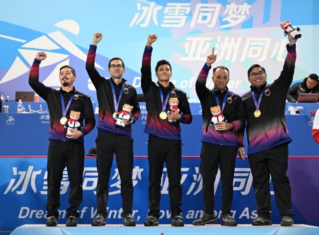 2月14日,第九届亚冬会男子冰壶颁奖仪式在哈尔滨举行。菲律宾队获得冠军。新华社记者 赵子硕 摄