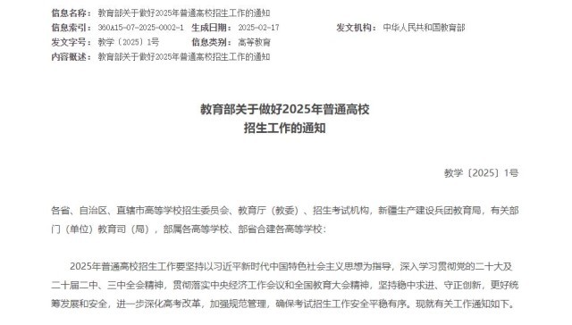 央视网消息:2025年普通高校招生工作要坚持以习近平新时代中国特色社会主义思想为指导,深入学习贯彻党的二十大及二十届二中、三中全会精神,贯彻落实中央经济工作会议和全国教育大会精神,坚持稳中求进、守正创新,更好统筹发展和安全,进一步深化高考改革,加强规范管理,确保考试招生工作安全平稳有序。现就有关工作通知如下。